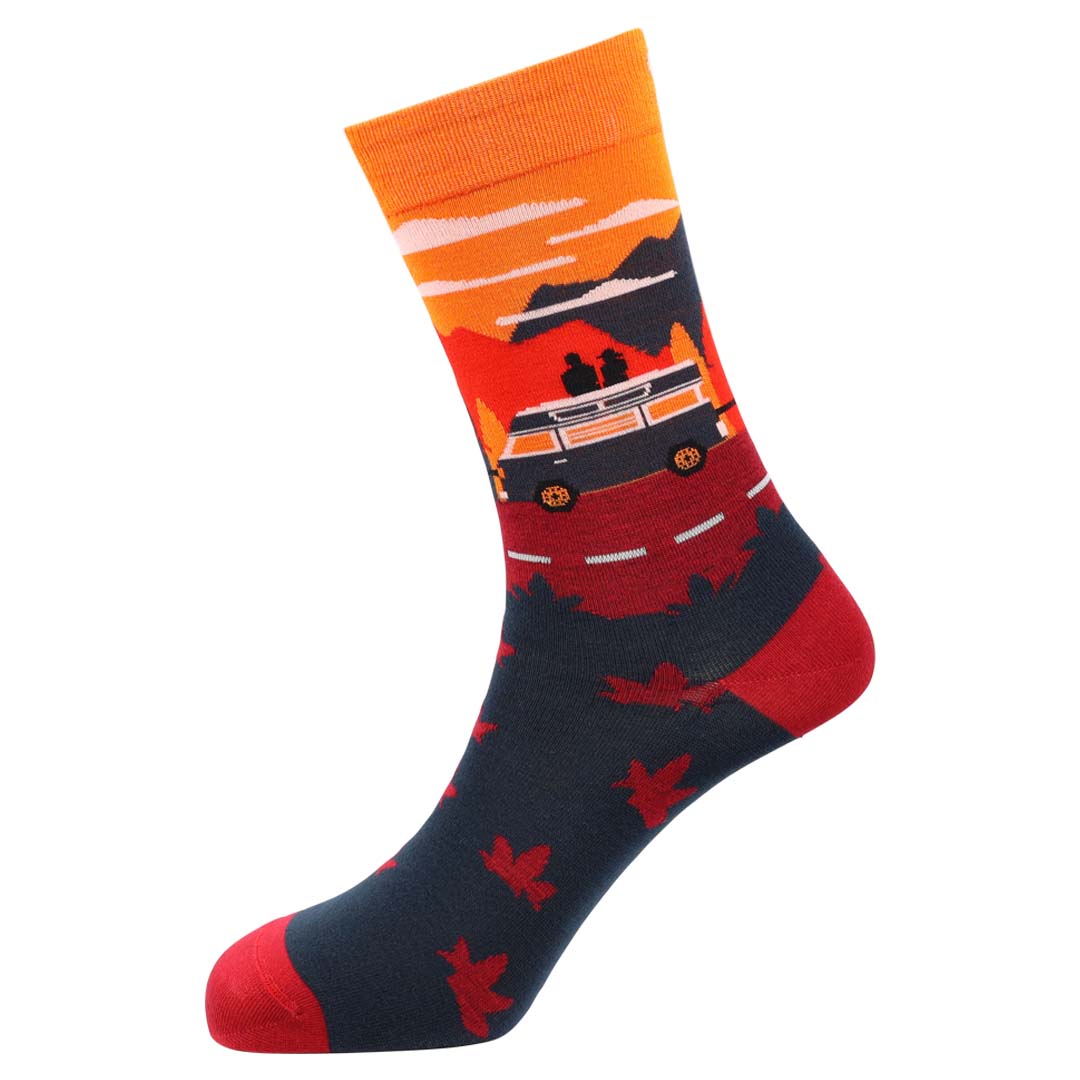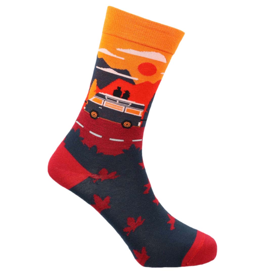 For the free spirits and road trippers at heart, our Nomad socks capture the magic of chasing sunsets and open roads. Featuring a retro van parked against a glowing orange sky with autumn leaves falling beneath, they’re a reminder that adventure is always just around the bend.