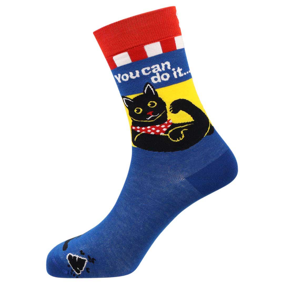 Channel Rosie the Riveter with a feline twist in our You Can Do It socks featuring a bold black cat striking a playful flex beneath the uplifting cuff copy “You can do it...”, finished with a red polka-dot bandana. Bright panels of blue, yellow and red give the design a retro-poster feel, making these socks an instant mood lifter.
